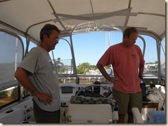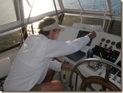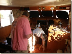 Mike and I had a beautiful day on the water. Tampa Bay was smooth and the traffic was very light on the Intracoastal. Our destination for the evening was Robert’s Bay, an anchorage we had never stayed in during the many times we headed south from St. Pete to Ft. Myers Beach. We arrived 40 miles later at Robert’s Bay and, after moving slowly into the anchorage because of “skinny” water, we had the anchor dropped shortly before dusk. The Captain spent some time with Mike showing him how to deploy the dinghy off the sundeck and then grilled steak for dinner for our first night out on the water.