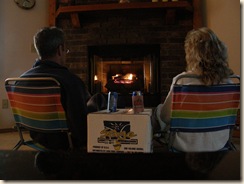 Sitting in front of the fireplace on our beach chairs in our empty living room using a cardboard box for a table. Time to go furniture shopping!